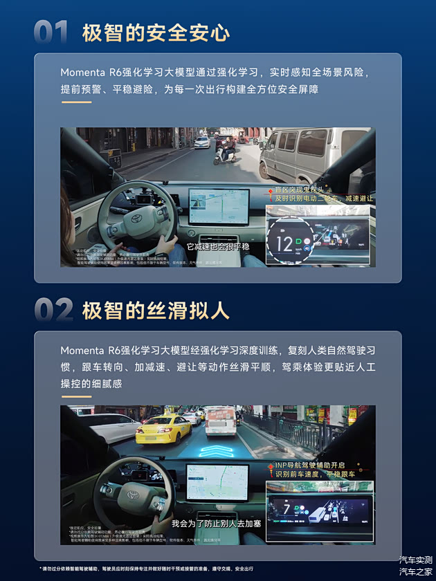 本次升级的核心是搭载Momenta R6强化学习大模型,旨在使车辆的智能辅助驾驶表现更接近人类驾驶习惯。官方数据显示,升级后车辆在复杂路况的处理能力和风险场景的预判避险能力将获得倍数级提升。