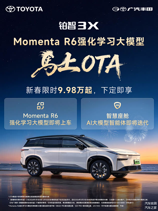 一次看不见的软件更新,正在让路上的 铂智3X变得更像一位经验丰富的“老司机”。广汽丰田宣布,其热销的纯电SUV铂智3X将于今年3月迎来重磅OTA升级。