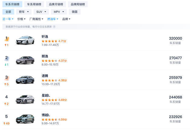 在人们几乎不再关注的燃油车市场,其实上演着同样的本土品牌的崛起剧本,只是这个剧本里,参与者只有吉利一个。没什么人注意到,过去一年里,销量排名前5的燃油车,吉利拿到了两个席位。