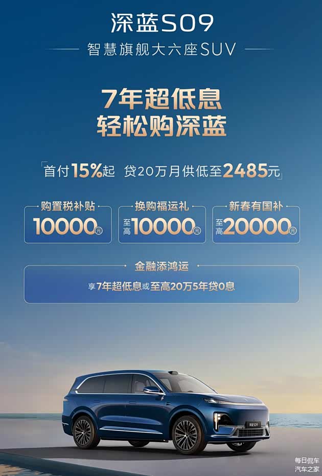 对于在外打拼了一年游子,春节载着家人回乡探望亲人是最神圣的事情。这款车既要让一家人乘坐得舒适,还要保证足够安全;既要在路途中有趣好玩,还要尽量少花钱多办事。在30万元以内,能够同时满足这些要求的车辆十分有限,深蓝S09是很好的选择。它座舱空间充足,载人与载物都能满足,鸿蒙座舱HarmonySpace5和华为乾崑ADS4带来丰富的座舱体验和安全便利的辅助能力。近期厂家还推出了丰富的购车礼遇,包括1万元购置税补贴、1万元置换补贴、2万元新春国补,还有5年0息或7年超低息金融补贴,首付只要15%,贷款20万元月供低至2485元。有兴趣的朋友可以抓紧时机出手,在春节前就能提到爱车。