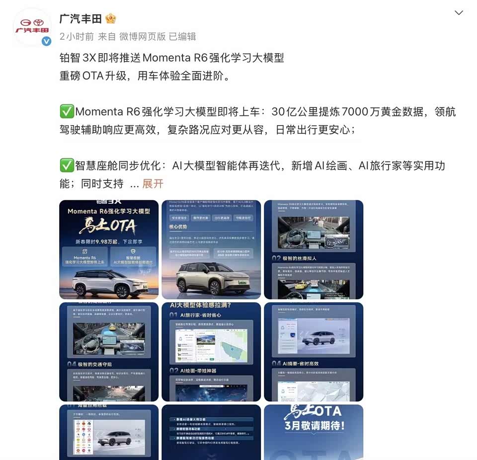 今日,广汽丰田 官方发布消息:铂智3X将在3月迎来一次重磅OTA升级。