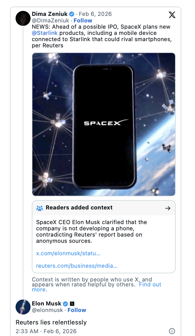 但是对于路透社的报道,马斯克这次明确驳斥,“纯属撒谎”、“我们没有开发手机”。