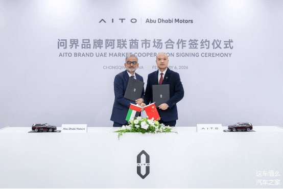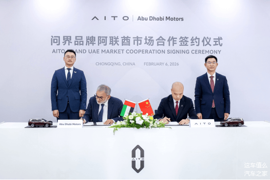 2026年2月6日,中国豪华汽车引领者AITO问界与阿联酋头部豪华汽车经销商集团Abu Dhabi Motors(以下简称ADM)在中国重庆正式签署战略合作协议。赛力斯汽车海外BU总裁王进与ADM CEO Syed Faiz Karim代表双方签署协议,赛力斯汽车总裁何利扬与阿卜杜拉·本·穆罕默德·本·布蒂·阿勒哈米德阁下私人办公室中国区负责人赵頔见证签约。这次合作标志着AITO问界在海外高端新能源市场的布局取得关键进展,正式开启品牌全球化的新篇章。