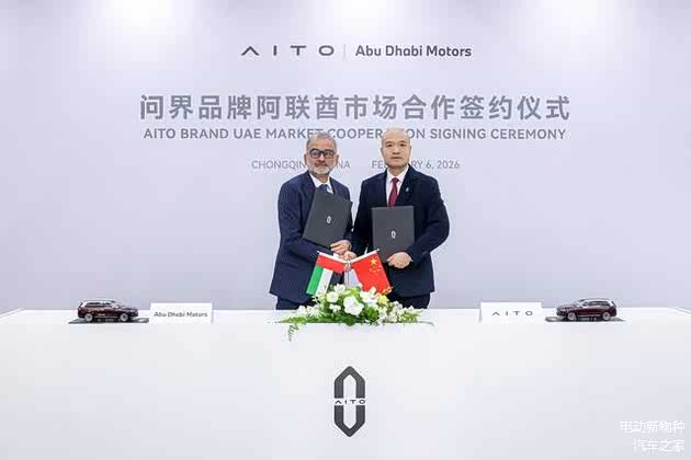 2026年2月6日,中国豪华汽车引领者AITO问界与阿联酋头部豪华汽车经销商集团 Abu Dhabi Motors(以下简称 ADM)在中国重庆正式签署战略合作协议。赛力斯汽车海外BU总裁王进与ADM CEO Syed Faiz Karim 代表双方签署协议,赛力斯汽车总裁何利扬与阿卜杜拉·本·穆罕默德·本·布蒂·阿勒哈米德阁下私人办公室中国区负责人赵頔见证签约。这次合作标志着AITO问界在海外高端新能源市场的布局取得关键进展,正式开启品牌全球化的新篇章。