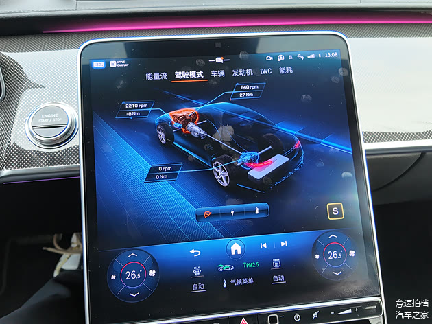 按下启动按钮,没有预想中的V8轰鸣,只有仪表盘亮起的微光提示车辆已就绪,这辆5.3米长的豪华座驾正以纯电模式无声滑出车位,平静得让人几乎忘记它体内蕴藏着1430牛·米的狂暴扭矩。在普通模式下,它的底盘悬架可以熨平路面上绝大多数颠簸,车内噪音被有效隔绝;但当运动增强模式被激活,这台重达2.4吨的豪华座驾会瞬间变身,转向、油门、悬挂响应立刻敏锐起来。从4.0T V8发动机介入的那一刻,AMG标志性的低沉轰鸣包裹整个车厢,但经过精心调校的声浪更像是一种克制的宣告,而非粗暴的示威。