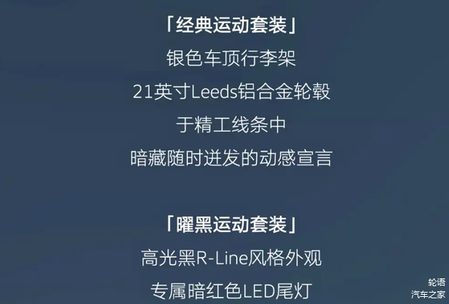 曜黑运动套装包含高光黑R-Line风格外观组件、21英寸Leeds轮圈、车顶行李架以及专属的暗红色LED尾灯,整体运动感突出。内饰延续了现款布局,采用平直的中控台线条,配备三辐式多功能方向盘、12英寸全液晶仪表以及15.05英寸悬浮式中控屏。
