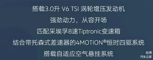 配置方面,新车提供360度全景影像与智能泊车辅助等实用功能。动力方面,新车搭载3.0T V6涡轮增压发动机,最大功率340马力,峰值扭矩450牛·米,传动系统匹配采埃孚8速手自一体变速箱。车辆同时配备了带托森中央差速器的4MOTION全时四驱系统以及自适应空气悬架系统。
