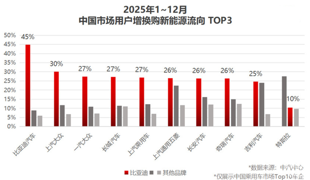 行业正从“得新客者得天下”转向“留老客者定江山”的新阶段。数据显示,在国内乘用车市场TOP 10车企用户中,平均每4个增换购新能源的用户里,就有1个选择了比亚迪。
