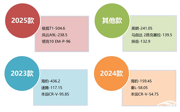 1月,2025款车型的投诉占比下滑至23%。不过,该年款车型仍有多个痛点引发车主不满,投诉焦点较为集中。极狐T1成为2025款车型中的投诉热点之一,其高压线束未配备护板的设计缺陷,给车辆行驶带来了潜在安全隐患,这一问题直接引发了车主群体的集中吐槽与不满。与此同时,此前闹得沸沸扬扬的风云A9L降价增配风波虽已基本平息,却因品牌承诺未能兑现,再次掀起小范围的投诉热潮。其他款车型的投诉问题各有侧重。马自达3 昂克赛拉因空调膨胀阀垫片生锈问题遭到了投诉。看似是不起眼的细小零部件质量缺陷,不仅会直接造成车辆空调功能失效,还潜藏着后续高额维修的隐性成本风险。探岳则因变速箱处于紧急运行模式、轮胎开裂等问题引起投诉。2023款和2024款车型的投诉榜首均是比亚迪海豹,未按最初承诺为车辆推送哨兵模式升级服务,成了车主吐槽的核心原因。