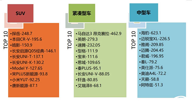 中型车投诉TOP10中,海豹投诉指数环比暴涨25倍,因未按承诺推送哨兵模式的升级冲上榜首。雅阁的投诉指数亦有明显上涨,悬架吃胎偏磨和发动机故障投诉声量出现回弹。