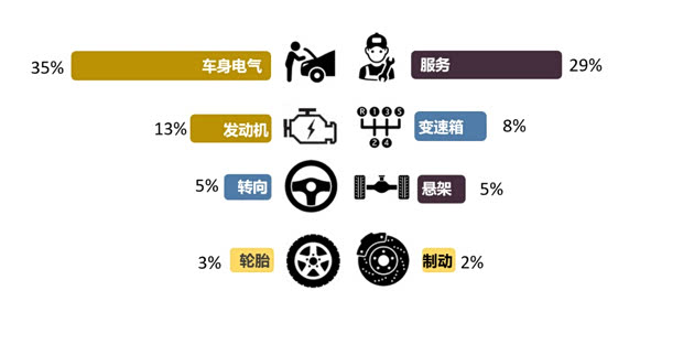 六、从投诉问题分布来看,车身电气与服务类问题成了投诉“重灾区”,合计投诉占比达到了64%,是影响车主用车体验的核心症结。在占比更高的车身电气类投诉中,减配、车身生锈、部件开裂成为车身电气类投诉的主要问题。服务类投诉同样不容小觑,其投诉指数占比达到29%。车机老旧不升级、订金不予退还、承诺不兑现等问题,一次次戳中消费者的维权痛点,成为引发车主不满情绪的主要导火索。值得警惕的是,此前有所缓解的发动机相关投诉,近期也出现反弹迹象。其投诉指数占比上涨了2%,发动机异响、发动机故障灯亮再度成为困扰车主的问题。
