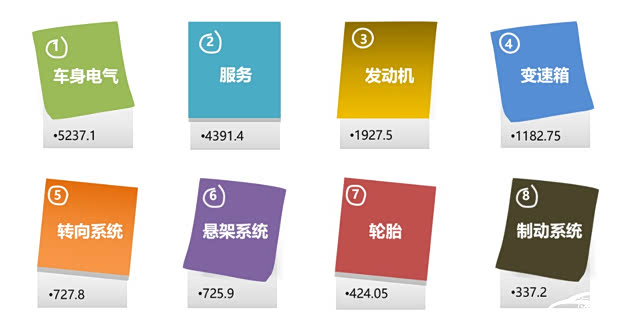 投诉指数:汽车门网全新构建汽车投诉指数计算模型(简称:QCMS),将车型质量投诉分为八大类,根据发动机、变速箱、车身及电气、制动系统、转向系统、悬挂系统、轮胎、服务等问题影响严重性分别赋权,并对集中性事件额外加权,最终形成有效投诉指数,指数越大越严重。