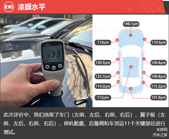 在漆膜水平测试环节,通过测试结果可以发现,整车漆膜平均厚度约为114.8μm,在测试过的同级别车型中处于中下游水平。从各关键部位的测试数据来看,仅前机舱盖的漆膜厚度达到较高水准,大多数部位的漆膜厚度均值只有110μm左右,整体漆膜厚度与漆面喷涂均匀性均表现不佳。