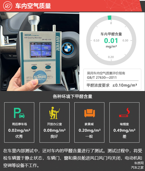 在车内空气质量测试环节,将车辆放置在车辆较少的内部地面停车场中,实测2026款华晨宝马iX1的车内甲醛含量为0.01mg/m3,符合2012年3月1日起实施的,由原环保部和国家质量监督检验检疫总局联合发布的《乘用车内空气质量评价指南》(中华人民共和国国家标准GB/T 27630-2011)中的相关标准。