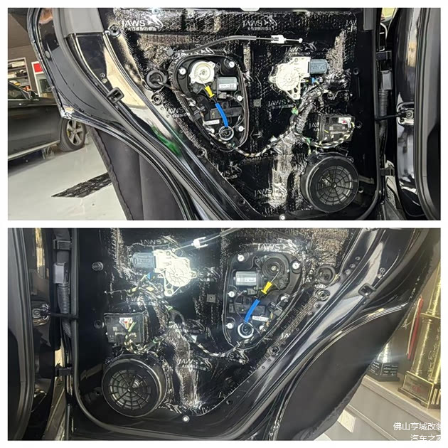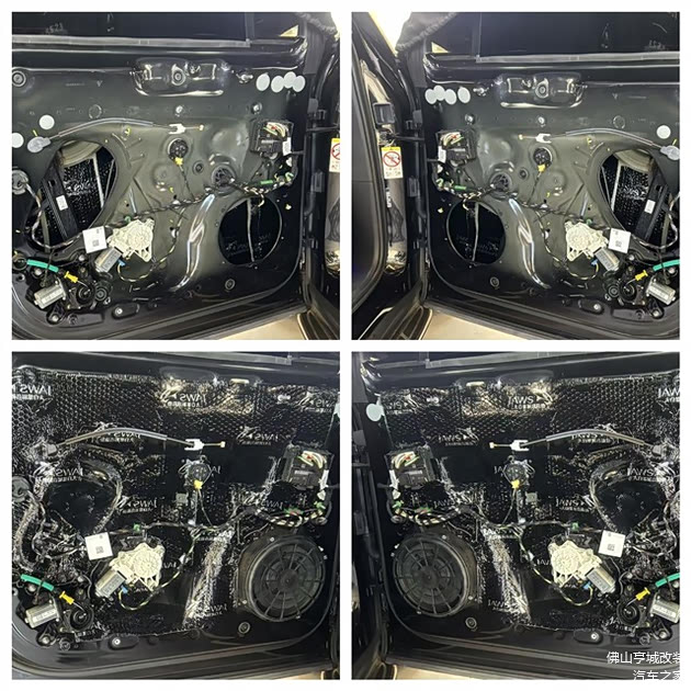隔音升级方面,全车选用大白鲨银鲨系列材料,该材料质地柔韧、粘性出众,能有效阻隔各类噪音,且环保无异味,契合豪华车型的品质要求。施工环节,技师遵循“分层隔音、精准降噪”的原则,先对原车门板进行彻底清理,再为前门板、后门板分别铺设双层大白鲨银鲨隔音,紧密贴合门板铁皮,有效抑制门板共振,阻隔风噪传入,同时为音响喇叭打造密封箱体,提升音质表现力。