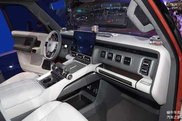 现在吉利对银河战舰的各种信息还捂得挺严实的,不过它在智能座舱、日常舒适性上肯定会看齐银河系列。从概念车上看,该车的座舱有一些很特别的设计:比如副驾驶有一块可显示方向、车辆姿态、海拔等信息的屏幕,可以在越野穿越时为副驾领航员提供更多的信息参考;车内具备制氧功能,能在高原穿越时防止车内人员高反。