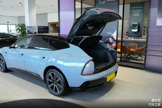 来到车身侧面,溜背线条从车顶滑到车尾,无框车门+隐藏门把手,轮廓干净利落,圆形轮拱19/20英寸轮毂(还能选曜黑款),低趴宽胎贴地感十足,运动范儿拉满,还把风阻压到0.252Cd,好看又实用。除此之外,车尾简约但有层次,贯穿式尾灯和前脸呼应,点亮辨识度拉满,再加悬浮尾翼、底部扩散器,运动感直接拉满,大掀背尾门还特实用,造型和实用一点不耽误。