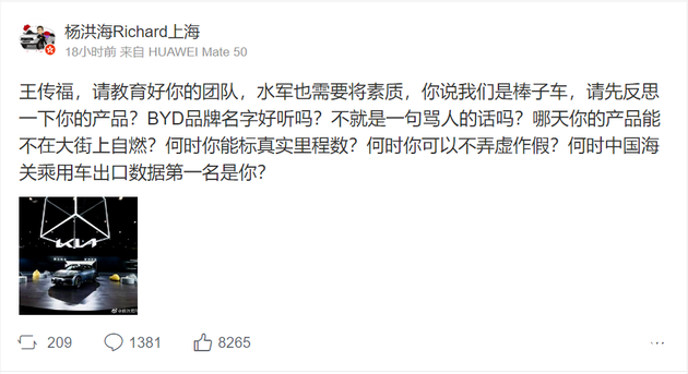 2023年2月,杨洪海入职起亚中国仅半个月,便在微博公开喊话比亚迪创始人王传福,抛出“王传福,你要教育好自己的团队”“BYD这名字好听吗?不就是一句骂人的话?”等挑衅言论,打破了车企高管间的基本礼仪,引发舆论对其职业素养的质疑。