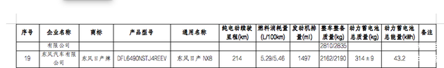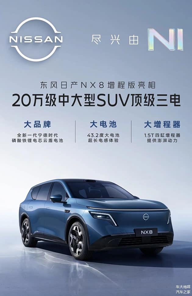 东风日产NX8基于天演架构打造而来,其中增程版本采用最大功率109千瓦的1.5T发动机,驱动电机最大功率195千瓦。据最新信息显示,东风日产NX8增程版支持匹配来自宁德时代的43.2千瓦时磷酸铁锂电池组,工信部纯电续航里程214公里。另外,早前申报信息显示东风日产NX8增程版还可搭载20.3千瓦时、21.1千瓦时、37.4千瓦时磷酸铁锂电池组,对应的工信部纯电续航里程分别为102公里、102公里、185公里。