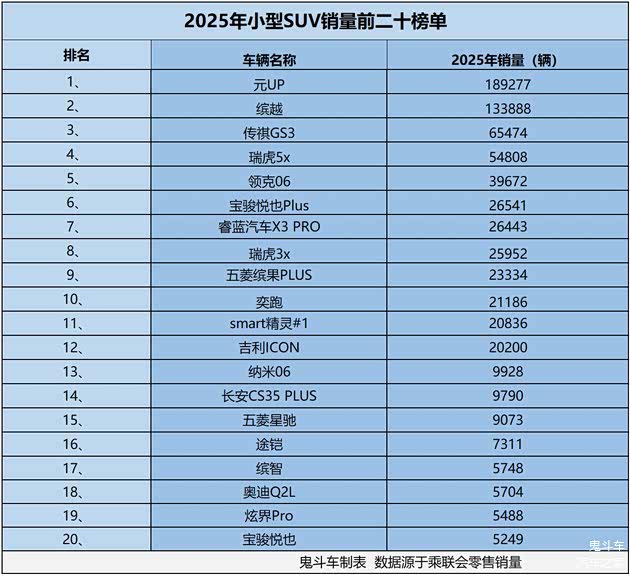 谁也没想到,曾经火爆的小型SUV市场变得如此惨淡。日前,乘联会零售销量数据出炉,鬼哥整理出2025年小型SUV销量前二十榜单,结果发现,整个榜单上,仅有两款车型累计零售销量超过十万,接下来,看看具体销量表现与车型排名?