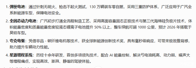广汽的电车技术也不差,电池有自研的弹匣电池,别的车企都不敢给自己的车兜底自燃包赔,但广汽敢这么玩,还有固态电池,广汽也已经开始小批量生产了,之前某些车企被大吹特吹的电驱方面,广汽也有自己的夸克电驱,理想引以为豪的增程技术,广汽也有自己的星源增程系统,广汽的电车技术一点都不比其他车企差多少的。