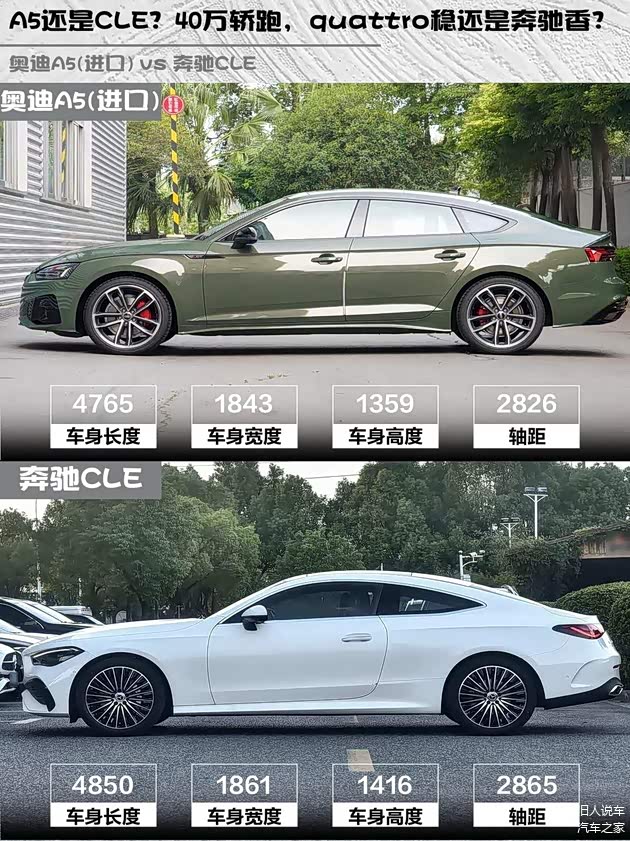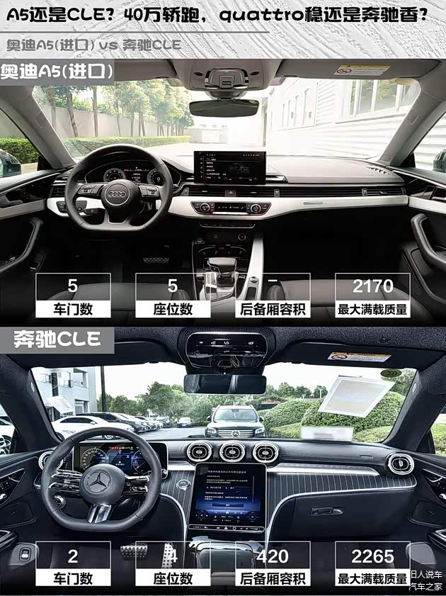 要纯粹驾驶乐趣选A5,quattro雨雪天更安心;要豪华氛围选CLE,但记得选装AMG套件不然太商务。两款后排都局促,经常载人的建议直接pass!