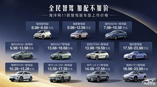 值得一提的是,比亚迪的智驾版新车型“加配不加价”,与此前车型价格相同。其中,首款搭载高阶智驾的小型车海鸥,仅需6.98万元就能体验。