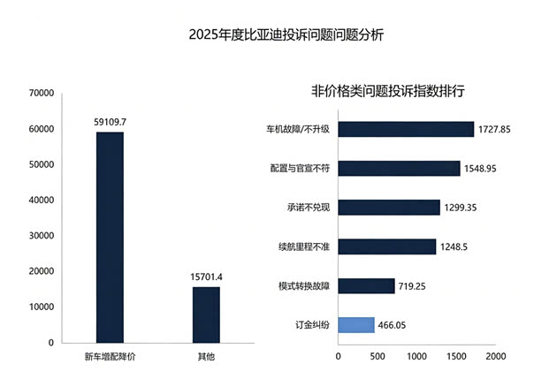 从投诉问题来看,2025年比亚迪因新车降价增配引发的投诉指数达到了59109.7,占其年度整体投诉指数的79%,更在服务类投诉指数中占据93%的绝对比重。显而易见,新车增配降价投诉正是导致比亚迪2025年整体投诉指数翻倍增长的幕后推手。