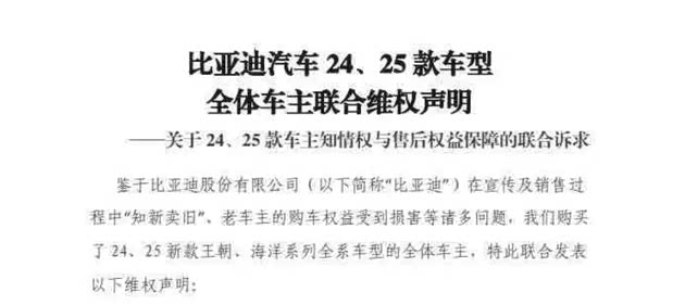 在喊出“智驾平权”一周后,众多老车主通过联合声明对比亚迪的销售行为提出质疑。网传的一份《比亚迪汽车24、25 款车型全体车主联合维权声明》显示:维权车主们认为比亚迪在明知新款智驾车型即将上市的情况下,仍以原价销售配置落后的库存老款车型,剥夺了消费者的知情权与公平选择权。新款与老款在车型名称、售价相同,但核心配置差异显著,导致大量车主在不知情的情况下购买了技术落后、配置滞后的车型。此外,比亚迪的这一系列操作导致老款车辆市场残值大幅缩水,二手车估值下降。