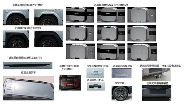 配置方面,新车标配了全景天幕,可以选装不同造型的轮毂、拖车钩、车身同色轮眉等等,主打力量感方面的表现。而且激光雷达很有可能是标配,意味着全系都有天神之眼B高阶辅助驾驶。