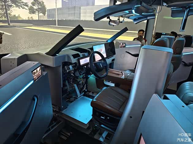 同时首次对外公开的还有头几年建成的智能交互实验室,投资超1200万元,其最大的亮点在于完全模拟了车辆驾驶时的环境状态,坐在主驾驶可以根据周边的各种投影、显示屏等感知实际驾驶时的感受,同时车辆可调节轴距、方向盘、刹车踏板、顶高等数据,可以把它理解为一个功能高端的模拟器,在研发阶段可以省去很多麻烦,调整好的数据可以直接用在实车成型的过程中。