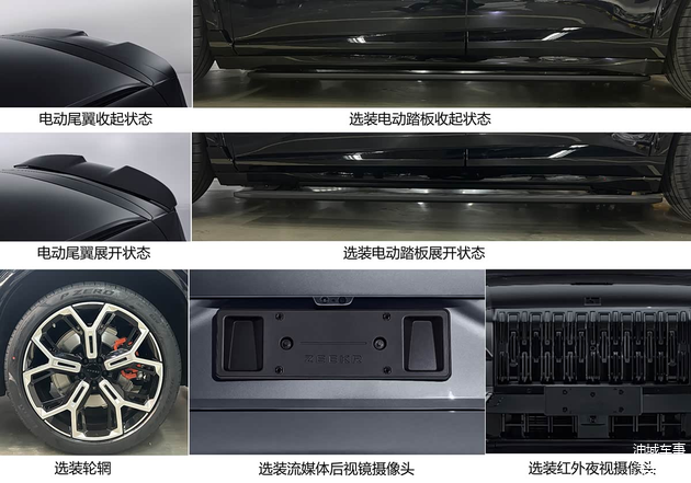 根据申报信息,用户可根据自身需要选装电动伸缩踏板、不同款式的轮圈、流媒体后视镜的摄像头以及红外夜视系统摄像头。这些配置为车辆提供了更高的个性化与功能扩展空间。