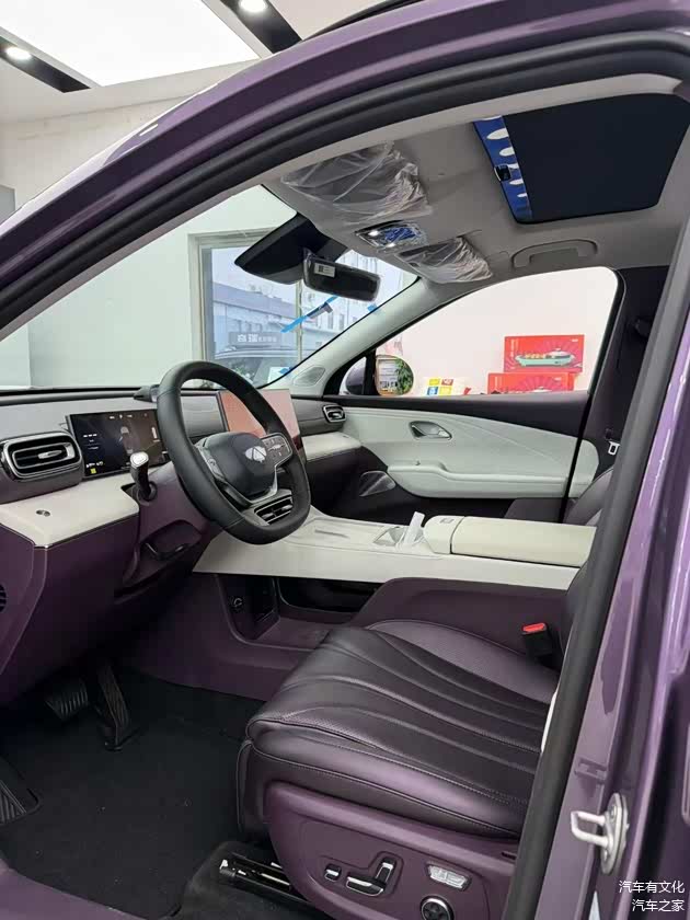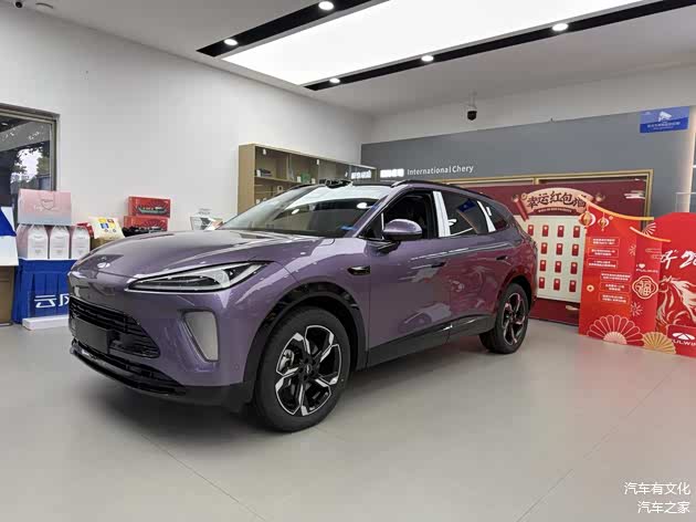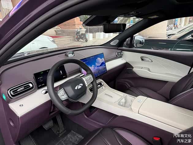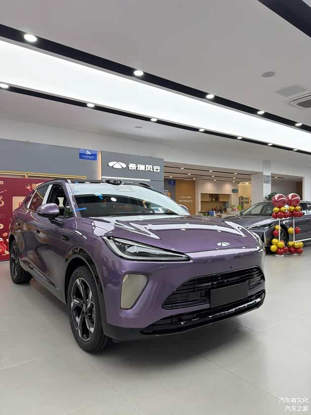 内饰是环抱式双层中控台,悬浮大屏加矩形仪表,搭载3nm 8678芯片的Carmind 1.5智舱系统,语音助手叫“小奇+AI”。方向盘是双幅式,换挡是怀挡设计,副仪表台有一排实体按键和50W无线快充。紫白双色内饰配皮质包裹、木纹饰板、立式中置扬声器和氛围灯,质感上做得不错。