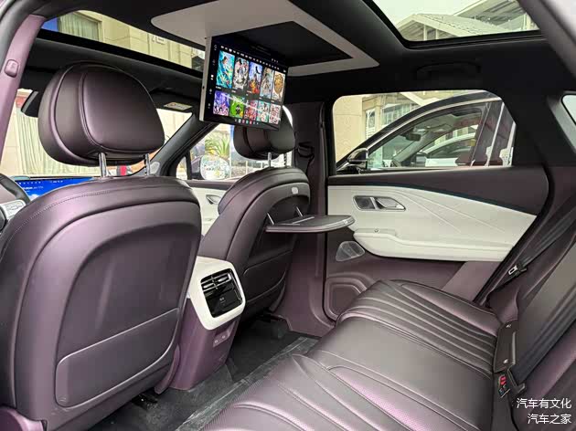 车内是大五座布局,前排两个零重力座椅,支持16向电动调节,带腿托、腰托、通风加热按摩。后排也能电动调节靠背角度,带通风加热,有17.3英寸吸顶娱乐屏、折叠小桌板和23扬声器音响。前排座椅靠背能放平跟后排连成“双人床”模式,后排也能放倒拓展空间。