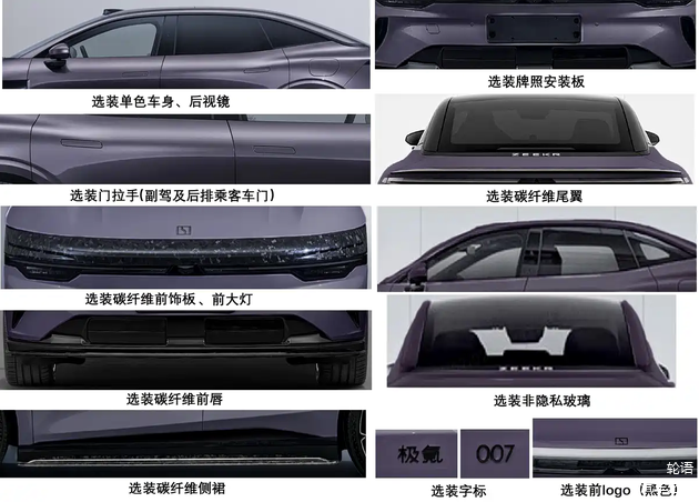 新款极氪007在外观上进行了小幅调整,其下包围两侧增加了通风口设计,并将提供包含前饰板、前唇、侧裙及后扰流板在内的碳纤维外观套件。