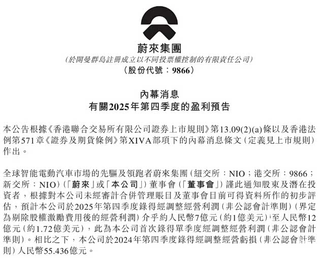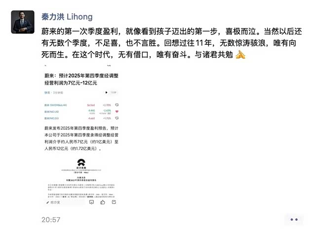 近日,蔚来发布盈利预告,预计2025年第四季度经调整经营利润约人民币7亿元~12亿元。按公认会计准则,预计是2亿~7亿元。