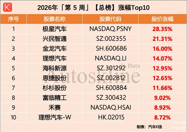 金龙汽车在发布一份同比增长35.32%的销量快报后涨停;理想汽车双股也纷纷进入涨幅前十。