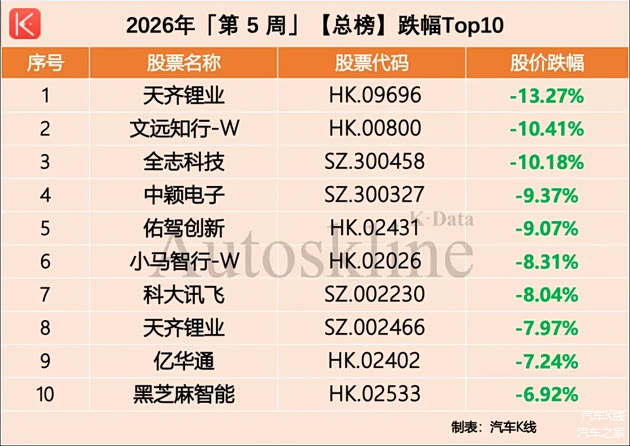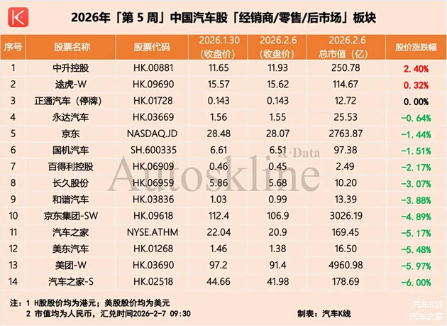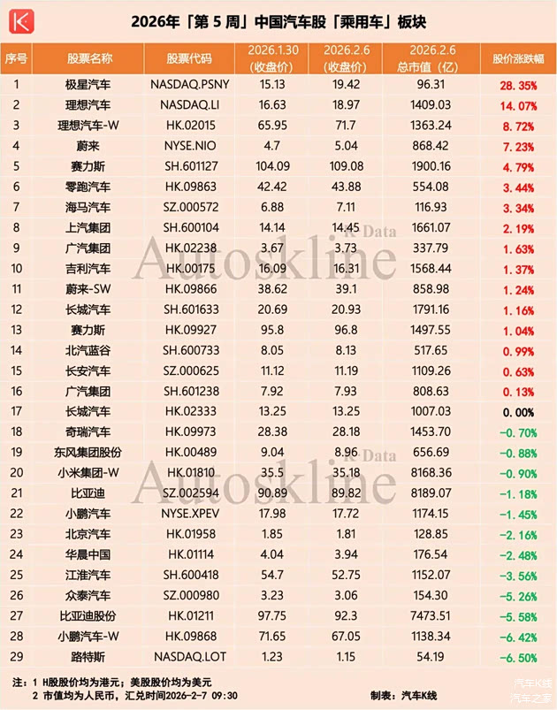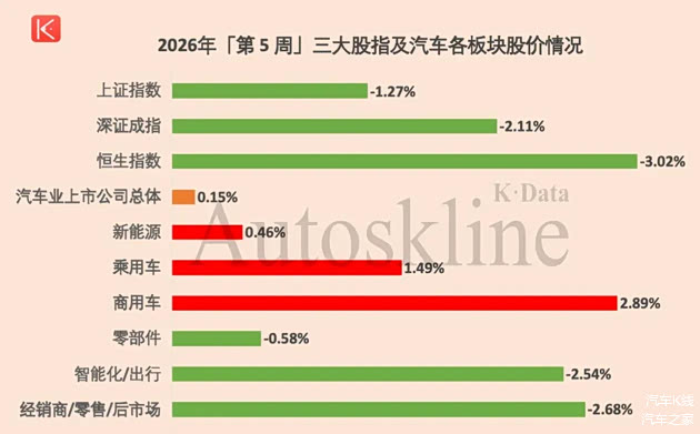 2月首个交易周,在上市车企一份份业绩预告和新年首月市场战报中,汽车股以微弱跌势收官,股价平均下跌0.15%,上涨个股数量不足五成;虽较前一周近6%的跌幅有所收窄,但仍反映出行业基本面的压力。