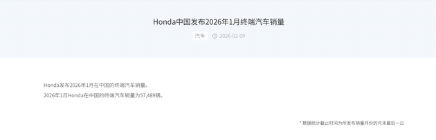 步入2026年,本田在华的市场表现依然低迷。据官方最新数据显示,2026年1月本田在中国的终端汽车销量为57489辆,同比下滑16.5%。作为参考,2025年1月本田中国终端汽车销量达到68890辆。