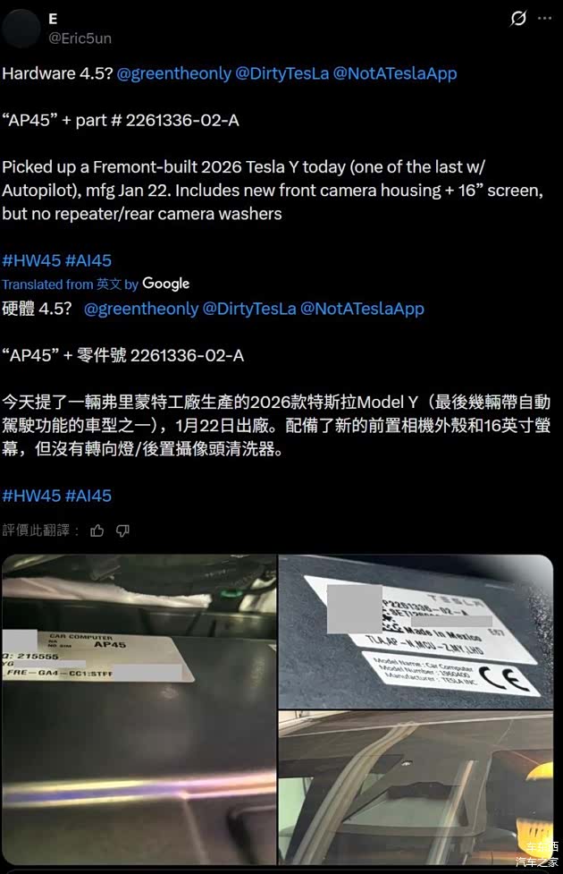 ▲车主透露2026款Model Y搭载HW4.5硬件