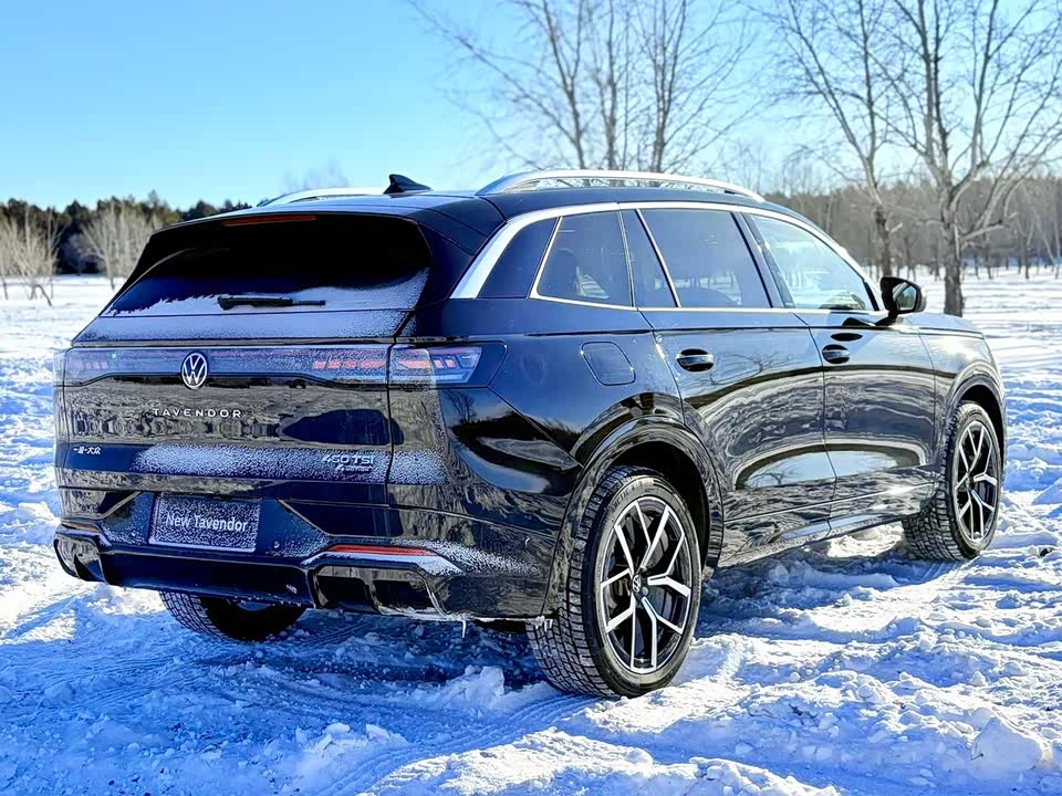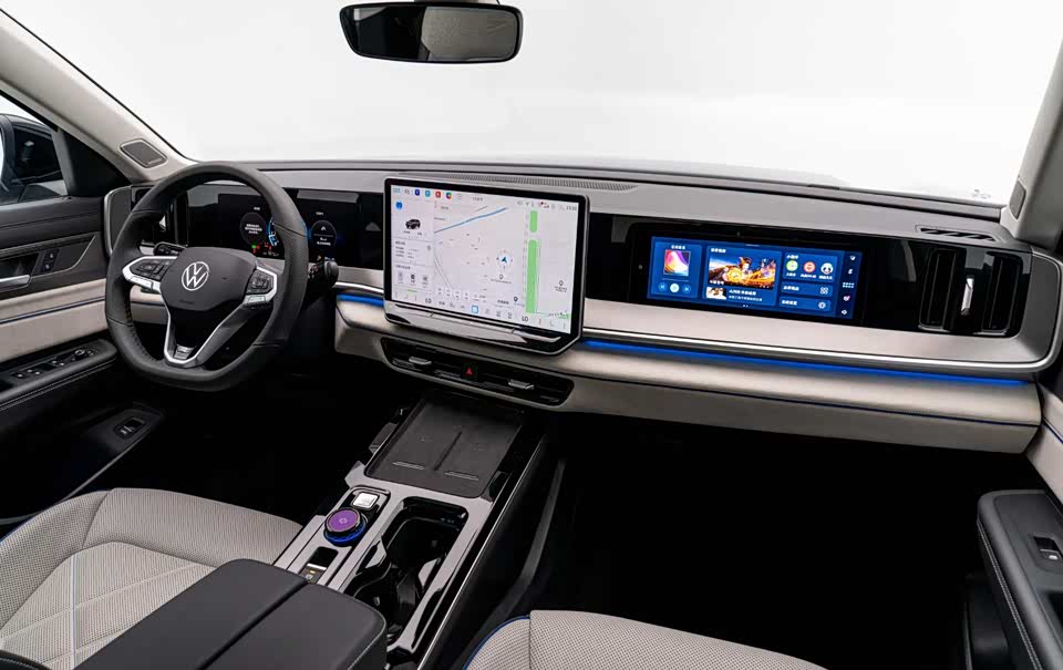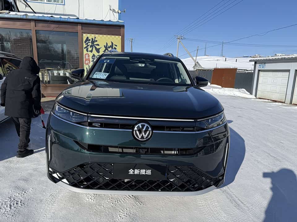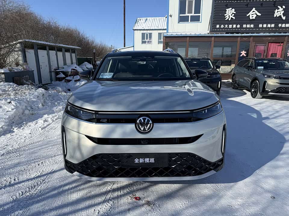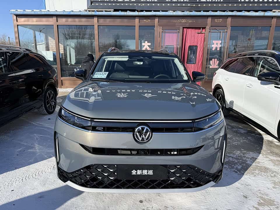 新款揽巡换上了更方正、硬朗的前脸。最吸睛的当属那条贯穿车头并延伸至两侧的LED日行灯带,配合能发光的“VW”标识,夜晚辨识度直接拉满。下方是狭长的矩阵式大灯,搭配大尺寸的熏黑网状格栅和运动化前包围,整个车头看起来霸气又充满科技感。