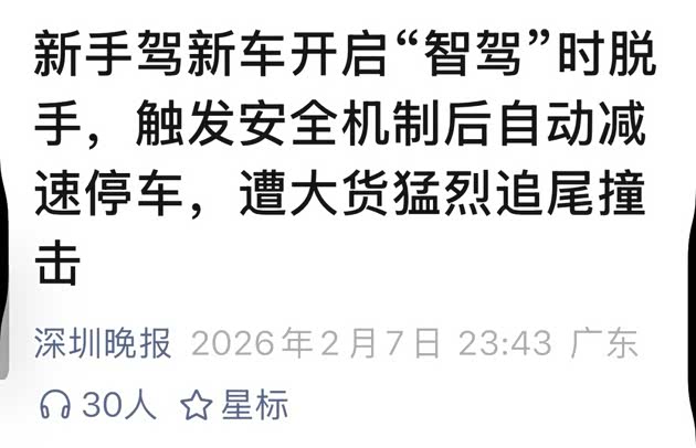 某官方媒体,注意这里是官方媒体报道一新手司机驾驶车辆是开启了智驾功能,结果因为长时间手脱离方向盘导致车辆触发安全机制车辆自动减速,被后方大货车追尾,庆幸的是人无大碍,只是这里得说一下这个自动减速的逻辑是否合理,和这个智能辅助驾驶到底智不智能,这是不是至少说明这智能辅助驾驶只看前不顾后呢?
