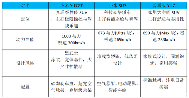 小米YU7共推出三种版本——标准版、Pro版、Max版,三种版本售价分别为25.35万元、27.99万元、32.99万元。而小米YU7 GT并非简单的“换壳车”,它在定位、性能与设计上均与现有车型形成了鲜明区隔。