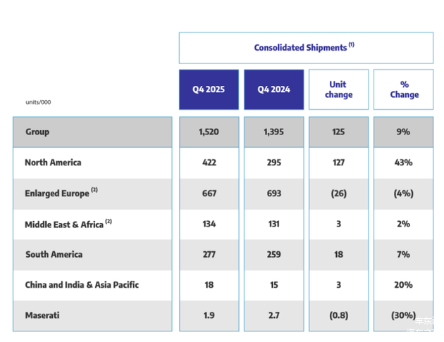 在2025年第四季度,Stellantis集团合并出货量估计为152万辆,同比增长9%。其中北美第四季度出货量较2024年同期增长约12.7万辆,同比增长43%。
