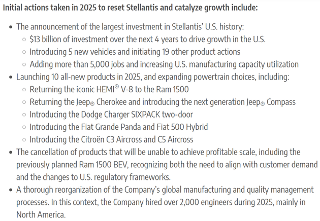 同时,Stellantis在2025年已开始采取行动,主要是调整产品计划和产品组合以符合市场需求。目前Stellantis采取的行动包括进行Stellantis美国历史上最大规模的投资,将在未来4年投资130亿美元(约合人民币900亿元),同时推出5款新车型。