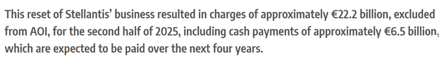 根据Stellantis方面在公告中的说法,此次Stellantis业务重组导致约222亿欧元(约合人民币1824亿元)的费用(不计入AOI),其中包括约65亿欧元(约合人民币534亿元)以现金支付,预计将在未来四年内支付。