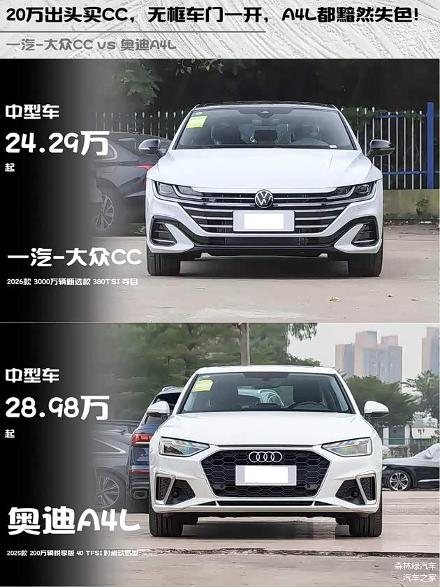 最近试驾了两款热门中型车—— 一汽-大众CC 2026款 3000万辆甄选款 380TSI 夺目和奥迪A4L 2025款 200万辆悦享版 40 TFSI 时尚动感型,发现这两台车简直是「西装暴徒」和「精致绅士」的终极对决!🔥