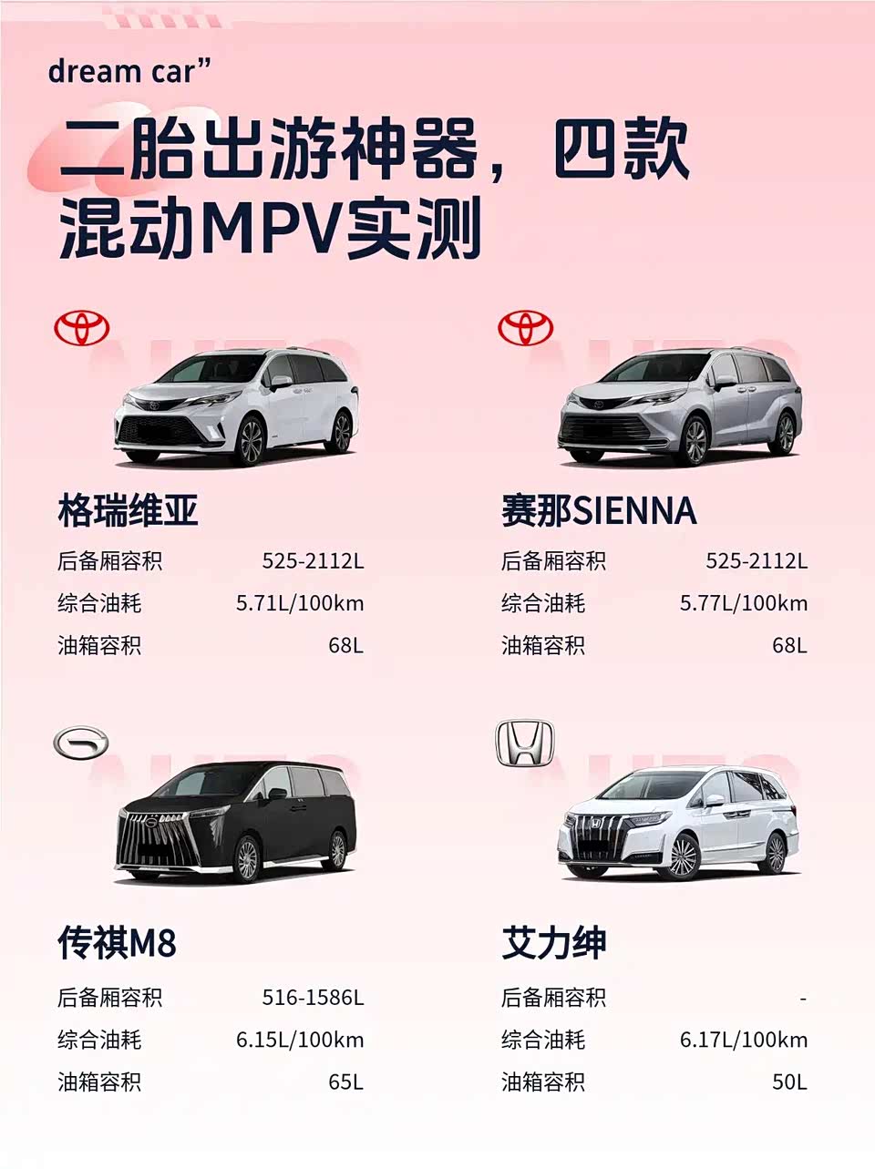 ⛽【省油专家】格瑞维亚WLTC 5.71L/100km实测一箱油跑1000km+;赛那双擎5.77L表现接近;传祺M8超级混动6.15L稍高;艾力绅6.17L但2.0L发动机高速再加速乏力。