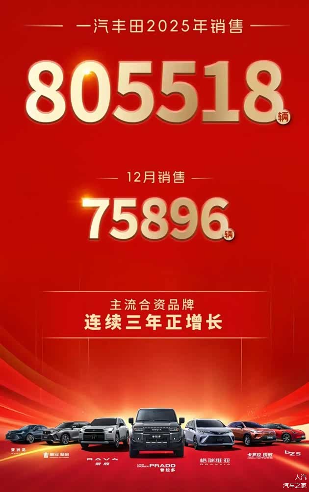 2025年,一汽丰田全年销售新车80.55万辆,成为主流合资品牌中唯一连续三年保持增长的企业。