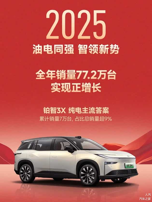 其中,凯美瑞全年销量达20.87万辆,稳居合资中高级燃油车市场前列;铂智3X全年销量超7万辆,成为合资新能源领域的亮点。
